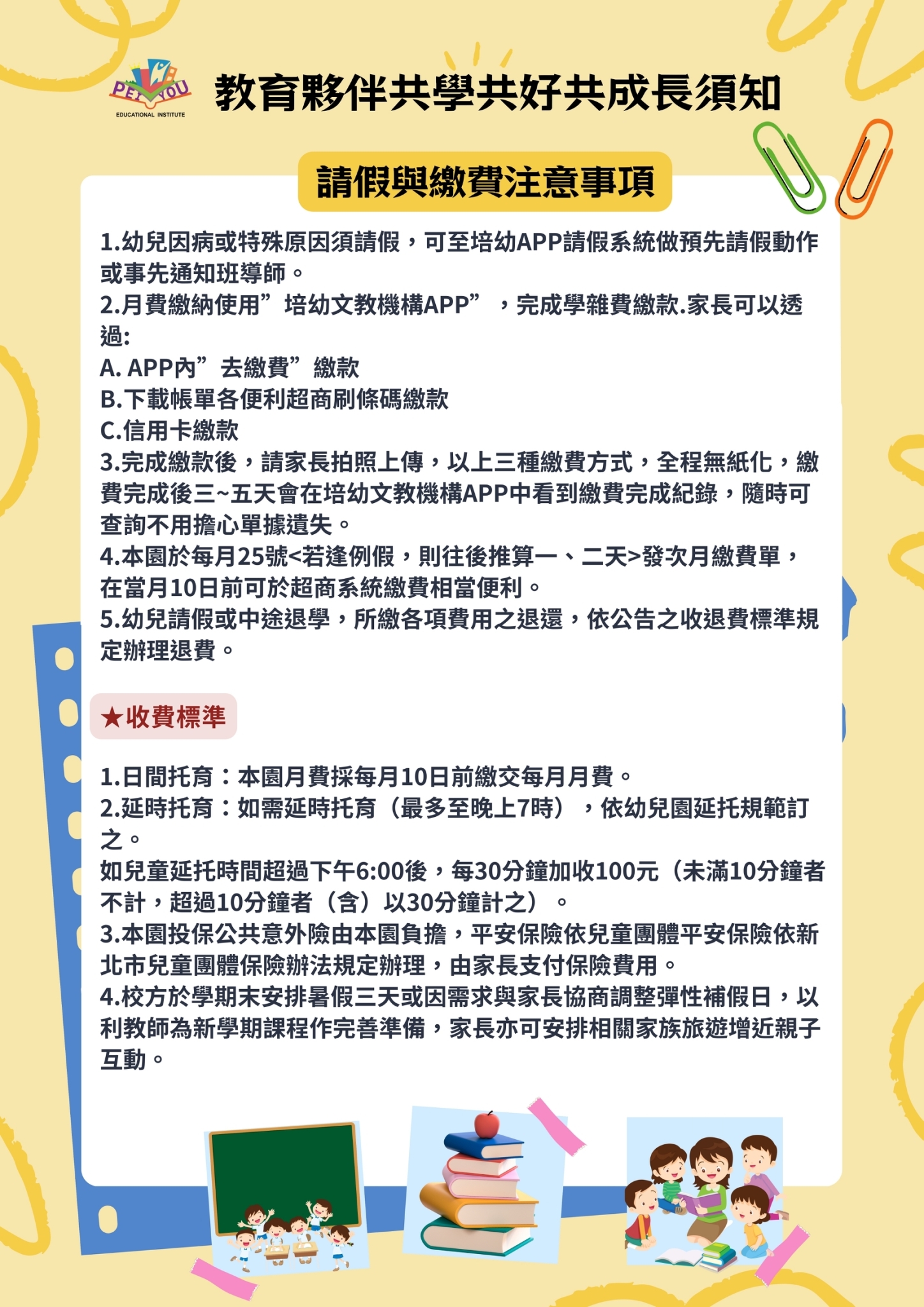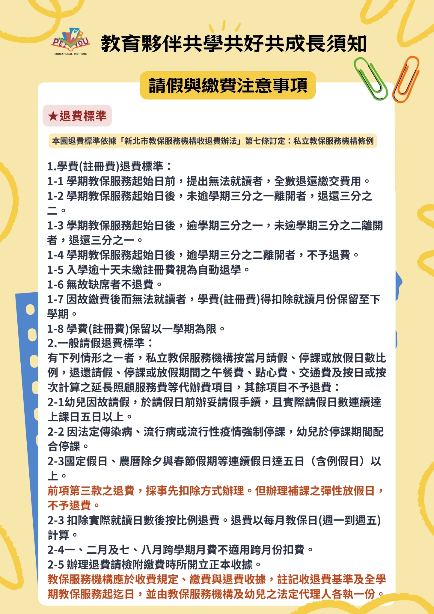 *當月請假、才藝須扣費,則統一於下個月抵扣上個月費用,但須補課之彈性放假日,不予退費。