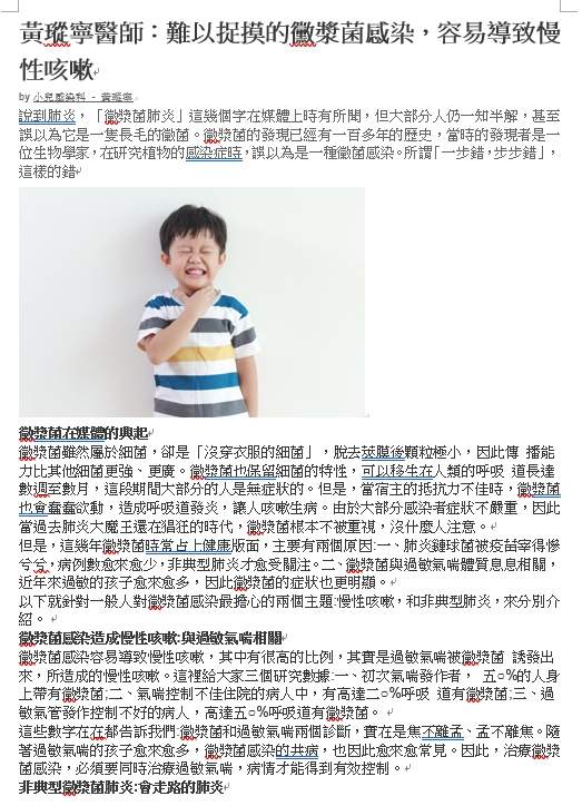112年6月份文章分享 難以捉摸的黴漿菌感染,容易導致慢性咳嗽https://www.parenting.com.tw/article/5095467?rec=i2i&from_id=5095466&from_index=4